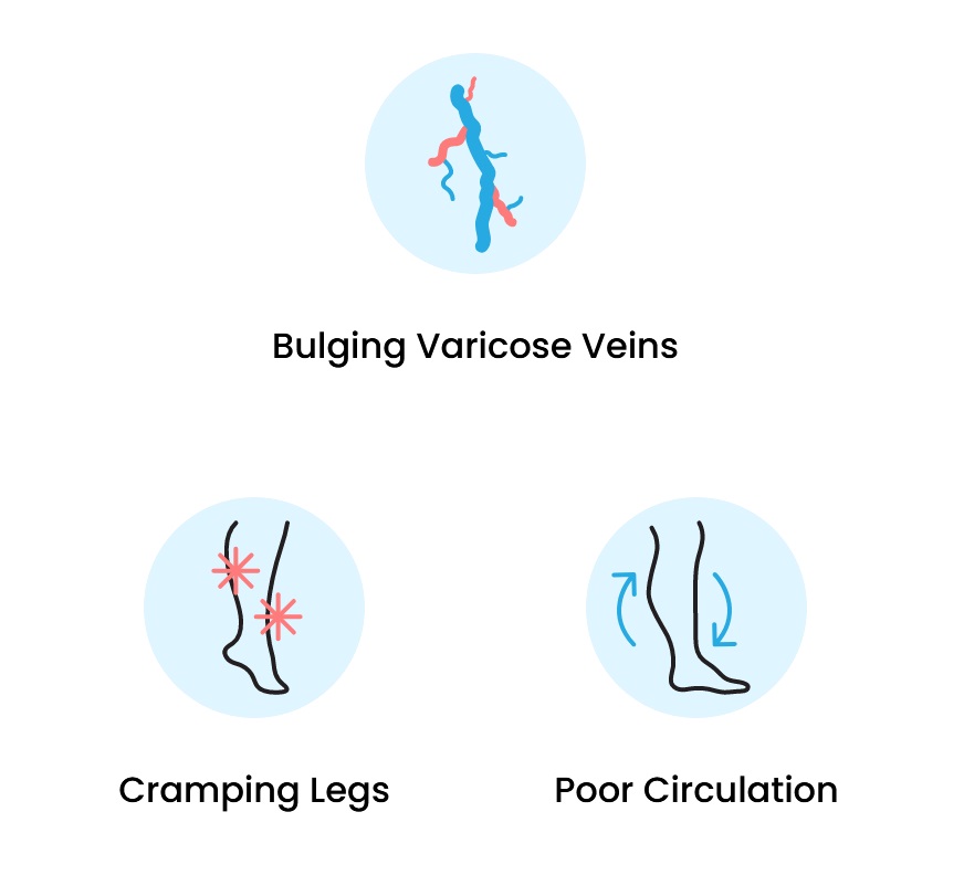 Mild symptoms of varicose veins include discomfort and bulging, twisted, visible veins on your legs. More extreme symptoms include leg pain, heaviness and fatigue in the lower extremities, swelling (edema) in the ankles or legs, bleeding, cramping, itchiness, sensitivity, and more. Varicose vein symptoms can worsen over time and may not go away without medical treatment.